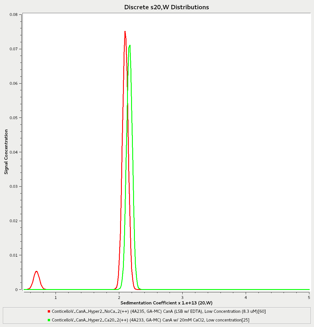I have analyzed the results from the one-hour incubation with calcium ions (20 mM for CanA and 1mM for Hyper2) at ambient temperature. In order, the four images attached are as follows: CanA High concentration (35.4 μM), CanA Low Concentration (8.3 μM), Hyper2 High Concentration (33.9 μM), and Hyper2 Low Concentration (10 μM). Within each plot, the red trace shows the results from the run with no calcium ions present, while the green trace shows the results from the run with the one-hour incubation with calcium ions at ambient temperature. Therefore, each plot compares a specific concentration of each protein before and after calcium ion incubation. As no significant shift in sedimentation coefficient values were observed, this would imply that none of the species underwent polymerization, at least to an extent that the instrument could detect. Despite this, both proteins thankfully still appear to be intact. In an earlier email you suggested that we could try incubating Hyper2 at ambient temperature for twenty-four hours, and then spin at ambient temperature again. For CanA, you suggested a one-hour incubation at thirty-seven degrees Celsius followed by spinning at thirty-seven degrees Celsius. Let me know how these next steps sound, and we can go from there.
