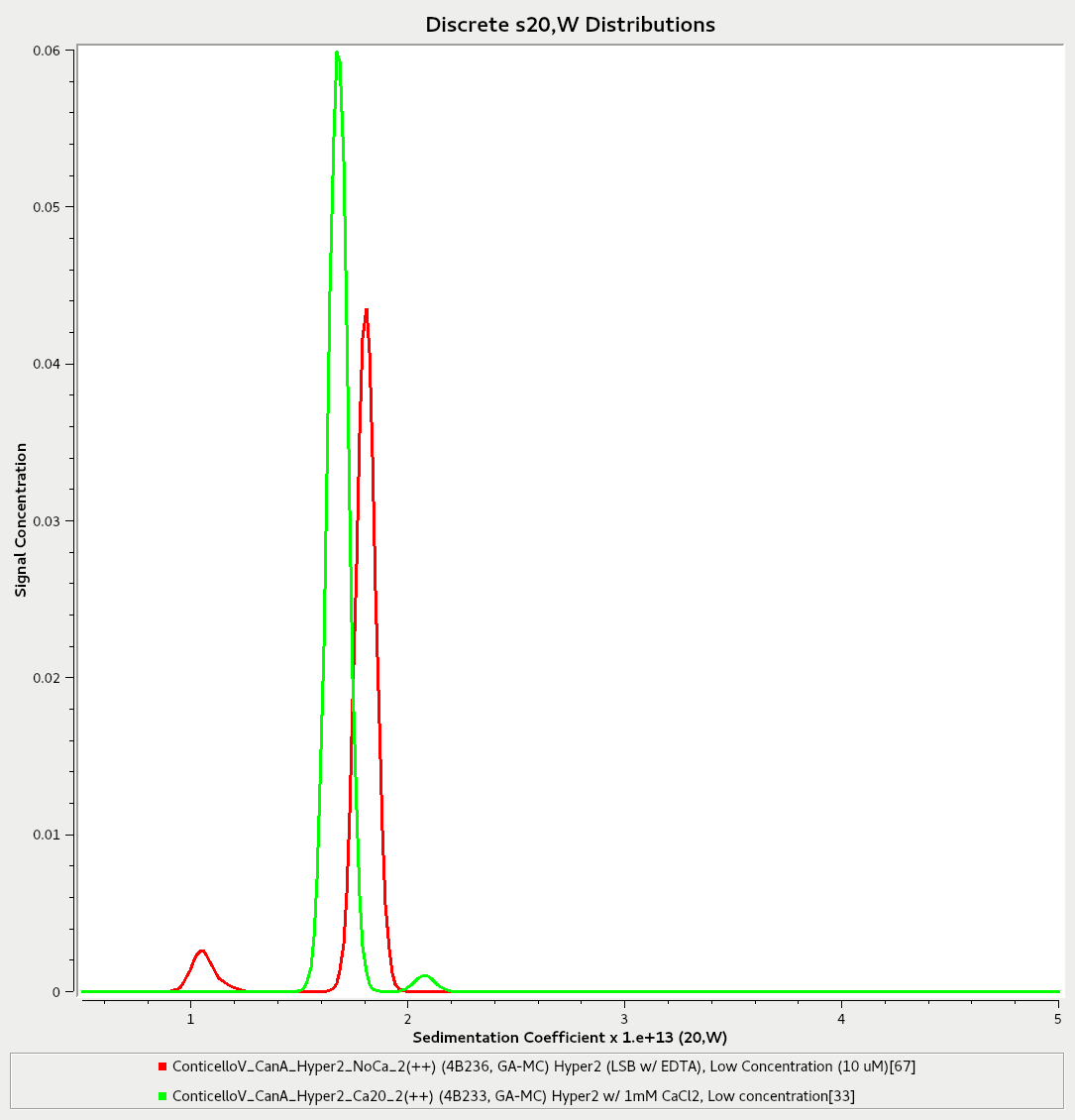 I have analyzed the results from the one-hour incubation with calcium ions (20 mM for CanA and 1mM for Hyper2) at ambient temperature. In order, the four images attached are as follows: CanA High concentration (35.4 μM), CanA Low Concentration (8.3 μM), Hyper2 High Concentration (33.9 μM), and Hyper2 Low Concentration (10 μM). Within each plot, the red trace shows the results from the run with no calcium ions present, while the green trace shows the results from the run with the one-hour incubation with calcium ions at ambient temperature. Therefore, each plot compares a specific concentration of each protein before and after calcium ion incubation. As no significant shift in sedimentation coefficient values were observed, this would imply that none of the species underwent polymerization, at least to an extent that the instrument could detect. Despite this, both proteins thankfully still appear to be intact. In an earlier email you suggested that we could try incubating Hyper2 at ambient temperature for twenty-four hours, and then spin at ambient temperature again. For CanA, you suggested a one-hour incubation at thirty-seven degrees Celsius followed by spinning at thirty-seven degrees Celsius. Let me know how these next steps sound, and we can go from there.